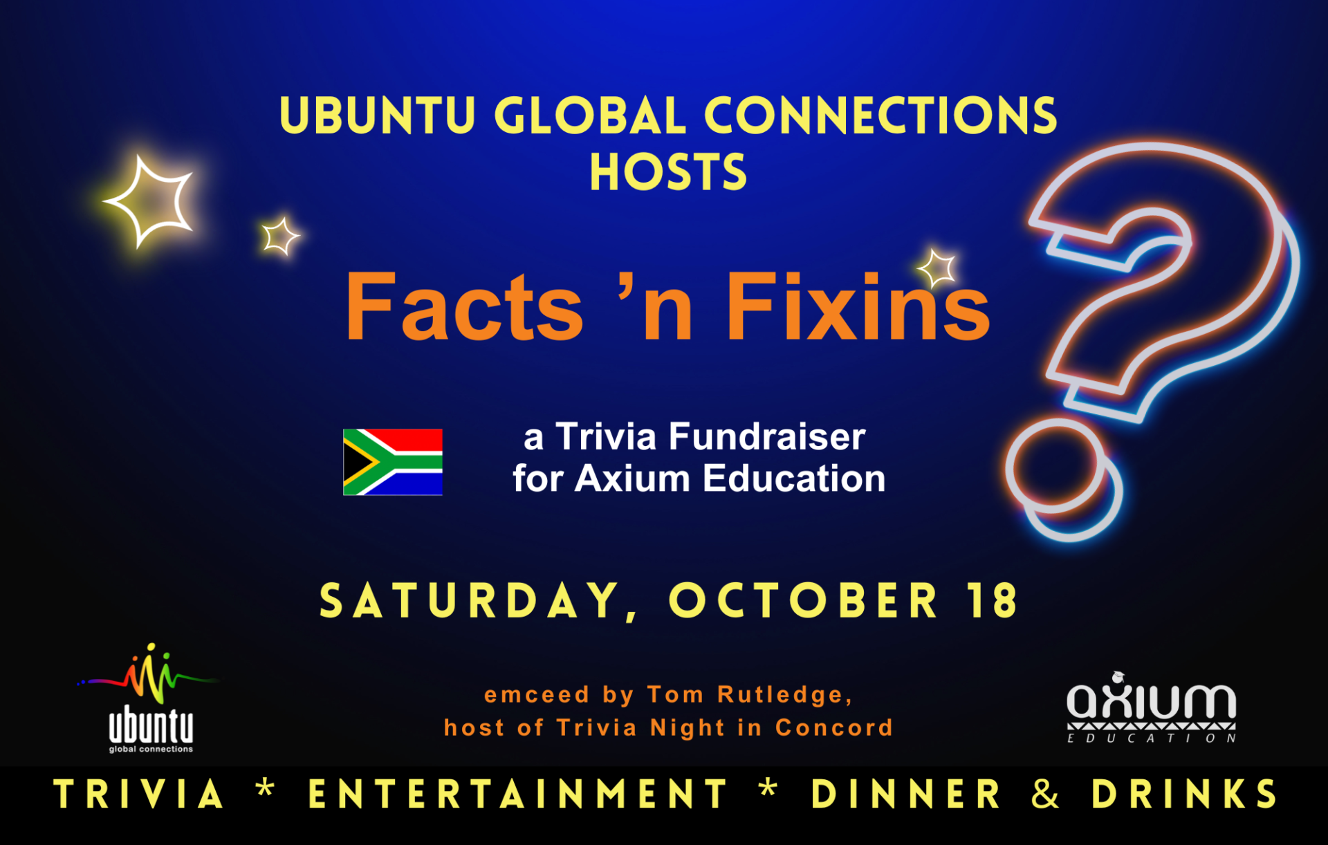 Join Ubuntu Global Connections for a fun Facts ‘n Fixins fundraiser to benefit the groundbreaking work Axium Education is doing in rural South Africa. You’ll also learn how Axium Education is bringing transformative change to students in rural South Africa.